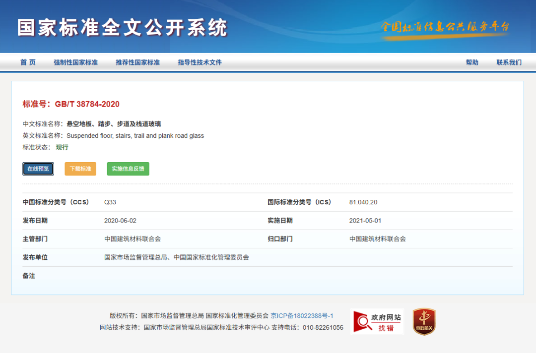 2021年5月1日起实施的国家标准 GB/T 38784-2020《悬空地板、踏步、步道及栈道玻璃》,规定了悬空地板、踏步、步道及栈道玻璃的术语和定义、产品分类、材料、要求、试验方法、检验规则及包装、标志、运输和贮存。