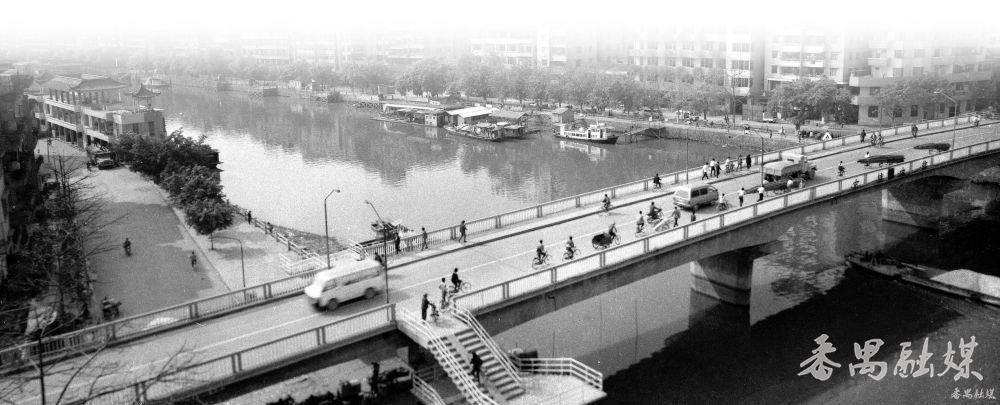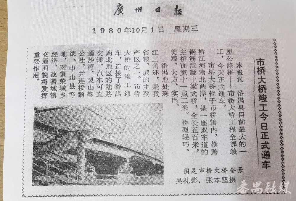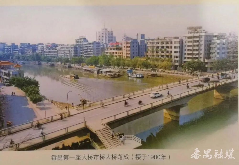 20世纪70年代前,市桥河南北两岸居民全靠渡船往来,交通极为不便。1975年,市桥大桥启动建设,1980年10月1日正式通车。彼时,它不仅是番禺最大的公路桥,更是市桥河水道上首座跨河大桥,全长294.12米,主桥段宽11.2米,引桥引道段宽8.4米,两岸引道各90米。