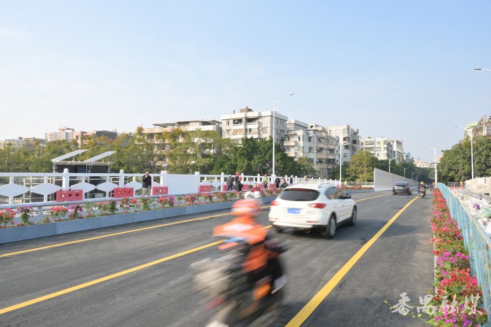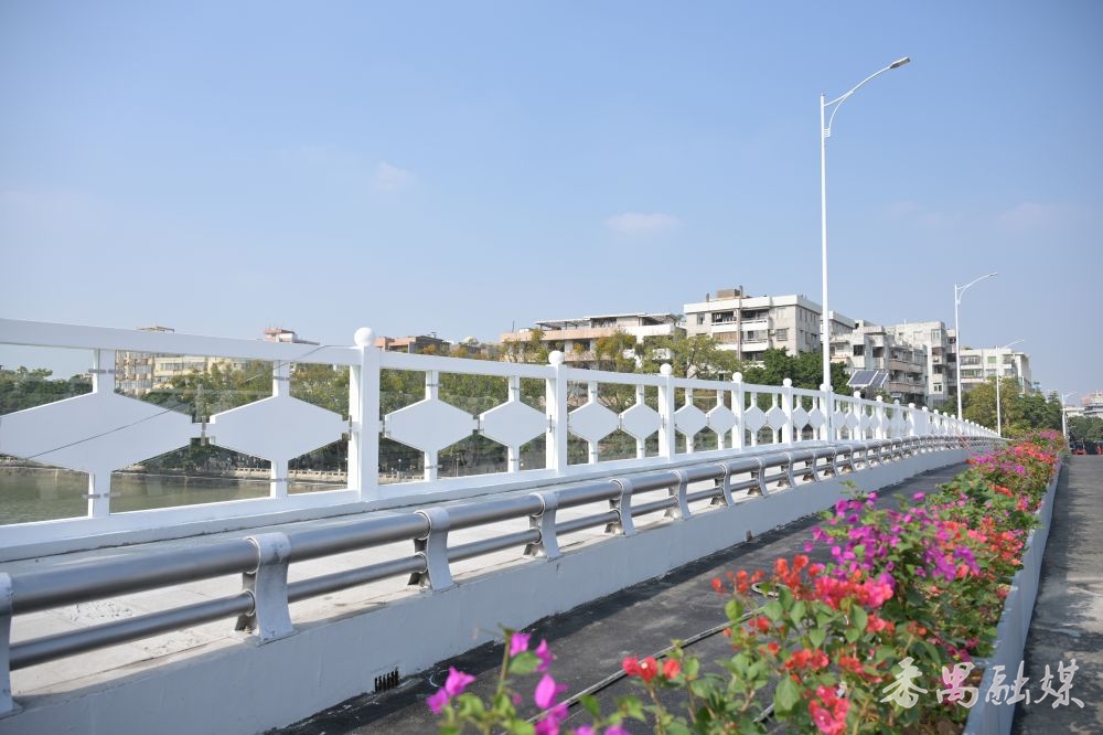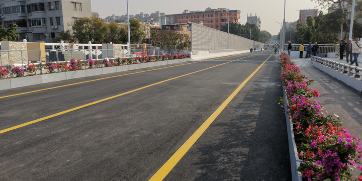 与旧桥相比,新桥有多处显著提升:主桥拓宽9.8米并增设人行道,跨径增大后提升了南堤路与长堤路的通行净空,桥梁长度较旧桥缩短43.8米;四个人行梯道同步拓宽,两侧加装降噪隔声屏障;主桥机动车道与人行道用花槽分隔,摆放134盆共402棵勒杜鹃,颜值大幅提升。此外,大桥南北岸还配套建设了两个微型公园,景观亮化工程包含桥底投光灯与LED洗墙灯。