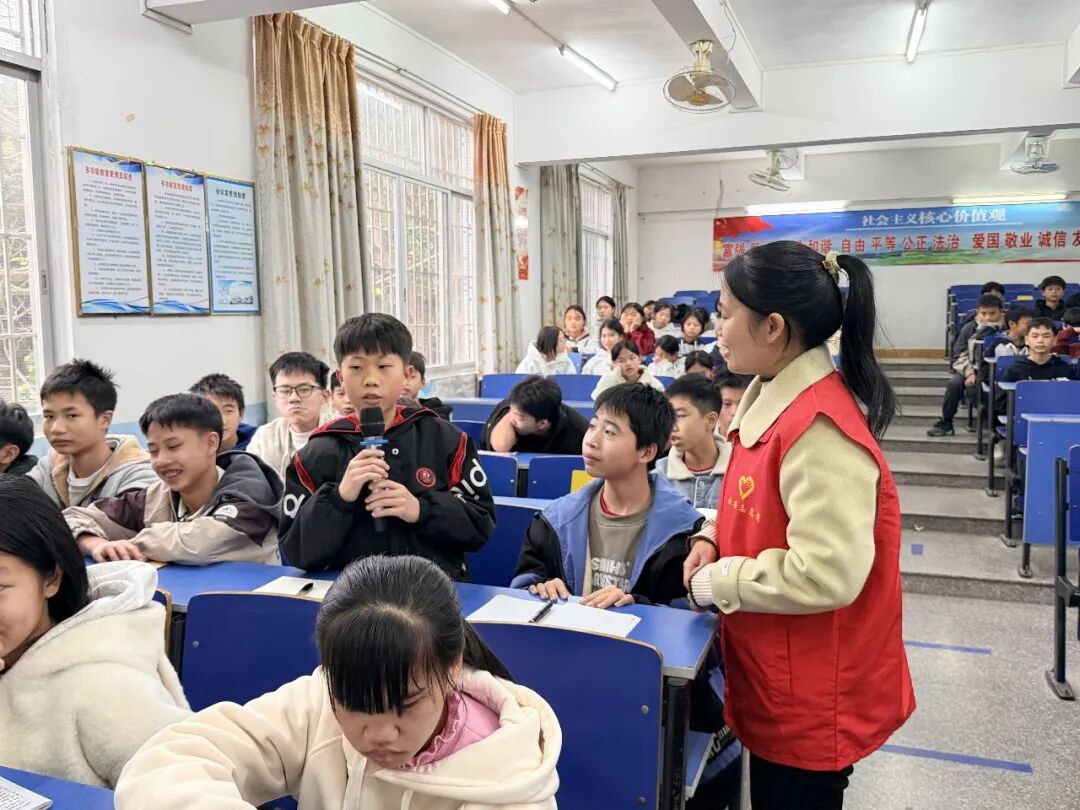 课程以趣味十足的“情绪天气预报”暖场,讲师让同学们用天气表达当下心情,快速融入课堂氛围。“与情绪做朋友”环节通过情绪猜猜猜、案例分析等形式,帮助同学们认识喜、怒、哀、惧四种基本情绪并传授了呼吸放松法、阳光充电、转移注意力等“情绪急救”技巧,引导大家学会正视情绪、科学调节情绪。随后的人际关系小课堂上,讲师围绕“如何结交朋友”“化解矛盾”等青少年常见困扰,通过小故事分享、互动讨论,传递了“己所不欲,勿施于人”的交往法则,以及积极倾听、清晰表达、尊重差异等沟通秘诀。整个课程寓教于乐,同学们积极参与、踊跃互动,在轻松的氛围中收获了成长智慧。