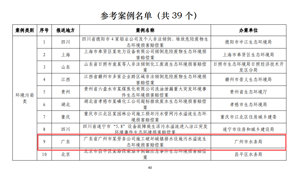 其中,由广州市水务局主办的案例“广东省广州市某劳务公司施工破坏城镇排水设施污水溢流生态环境损害赔偿案”入选国家第四批生态环境损害赔偿参考案例。