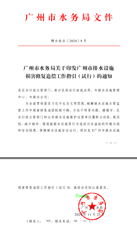 三是依托个案实践完善“监管—执法—修复”长效机制。立足本案办理经验,针对城镇排水设施损害追偿工作中存在的机制不畅、方向不明等痛点问题,广州市水务局及时制定印发《广州市排水设施损害修复追偿工作指引(试行)》。该指引有效增强了市、区水务部门及公共排水设施维护运营单位的履职主动性与规范性,构建起更为系统规范的排水设施“监管—执法—修复”工作流程,切实保障城镇排水设施运行安全与效能,为落实“损害担责”原则提供了可推广的水务解决方案。