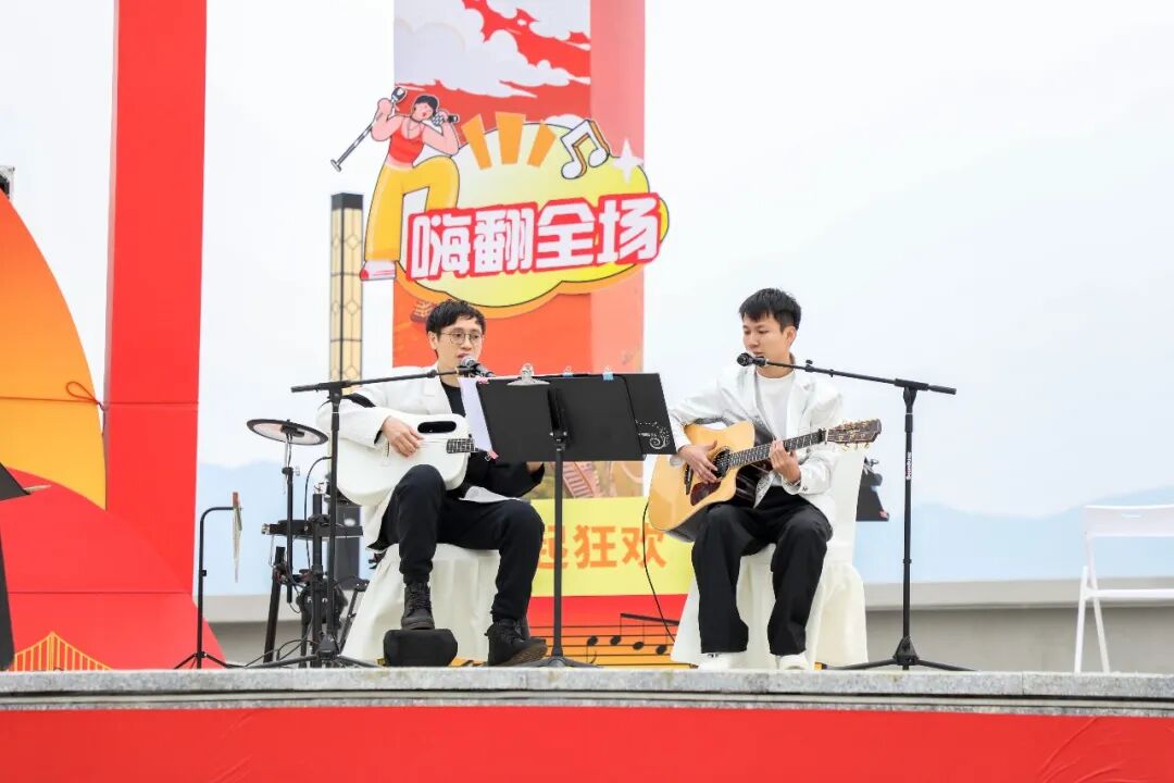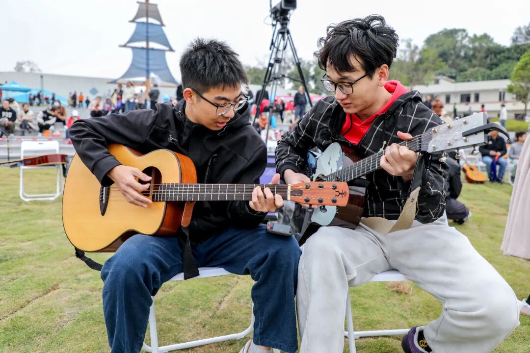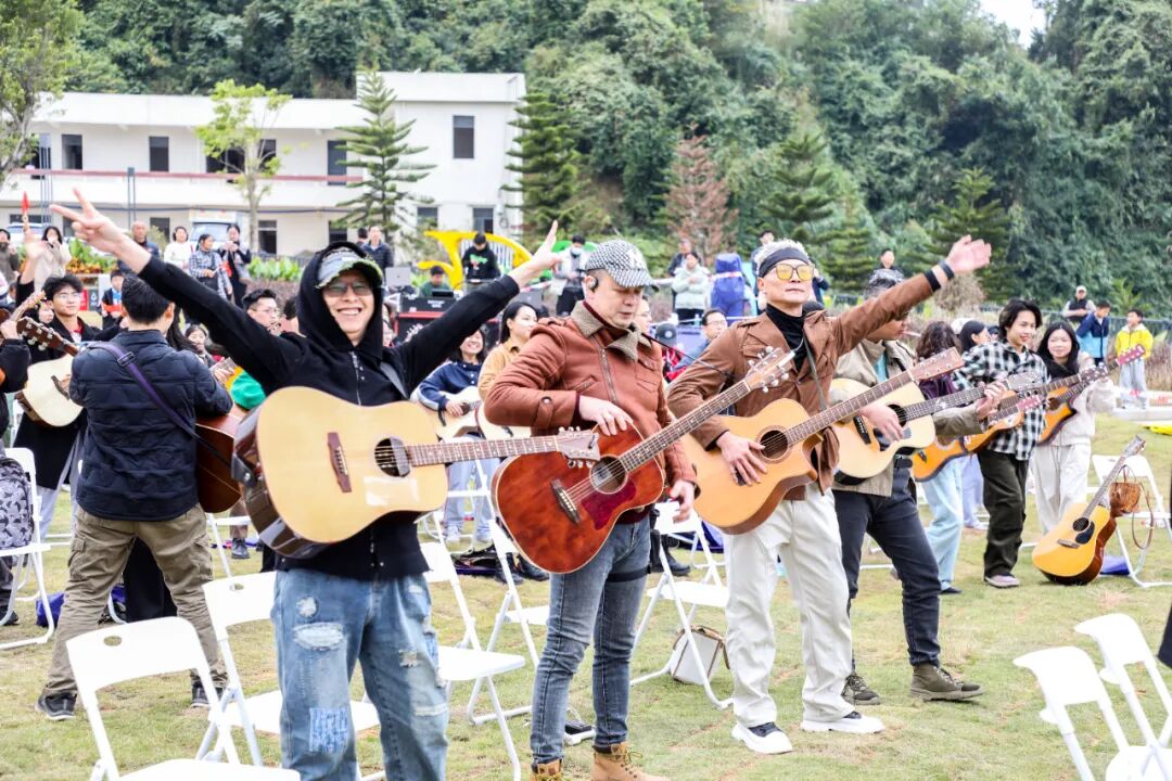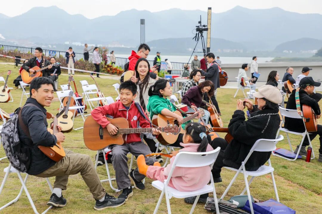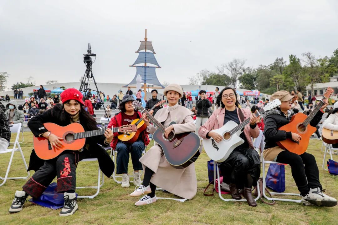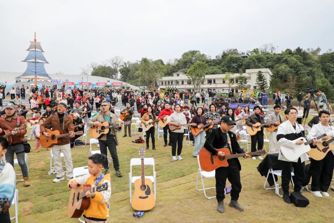 当天午后,云帆公园逐渐热闹起来,各地吉他爱好者陆续抵达,有序完成签到、选位等流程。随着音响设备调试完毕,系列暖场表演轮番登场,其中《气势如虹》的磅礴节奏与《云宫迅音》的梦幻旋律尤为亮眼,巧妙烘托出温馨又热烈的氛围,现场热度持续攀升。