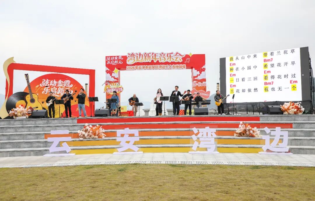 弦动金霞,乐启新元。1月1日下午,备受瞩目的2026年云浮市云安区千人吉他弹唱新年音乐会在都杨镇湾边村云帆公园激情开唱。来自各地的专业音乐人、吉他爱好者及现场观众齐聚一堂,以千人吉他弹唱齐鸣的声势,共同奏响新年奋进乐章,为元旦佳节增添了浓厚的文化氛围。区委常委、宣传部部长谢敬洪等到场观摩演出。