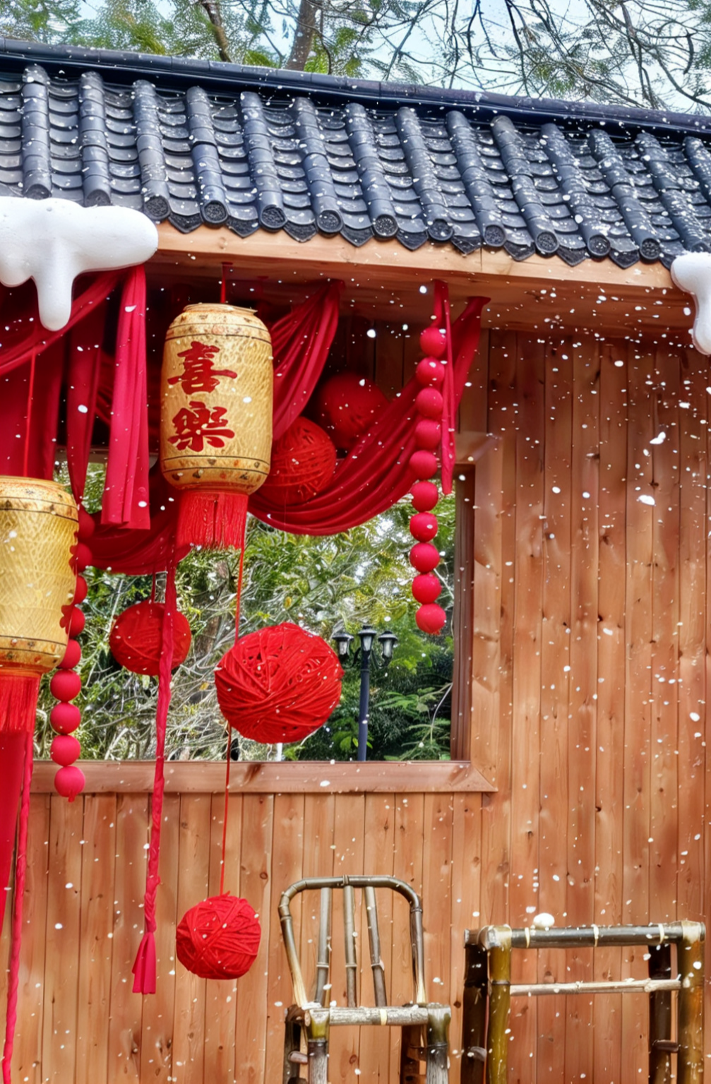 竹艺编织灯笼、积雪屋檐