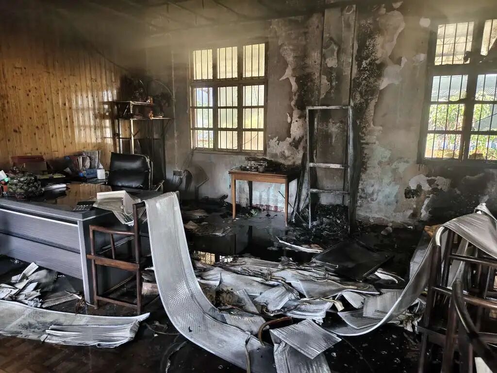 最终火势被扑灭,未造成人员伤亡,但办公室内墙面、电器、家具已被烧得一片狼藉。