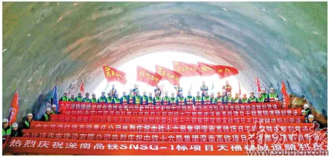 2025年12月27日,在广东省云浮市罗定市榃滨镇车田村的深山之中,由广东省铁路建设投资集团所属珠肇铁路公司建设管理、中铁十六局集团承建的深南高铁SNSG-1标段取得实质性进展——天福寨隧道最后一段岩体被成功打通,标志着这条千米长大隧道实现全线贯通。SNSG-1标段是深南高铁全线施工难度最大的标段之一,现场建设者们共同见证了这一重大节点的胜利攻克。