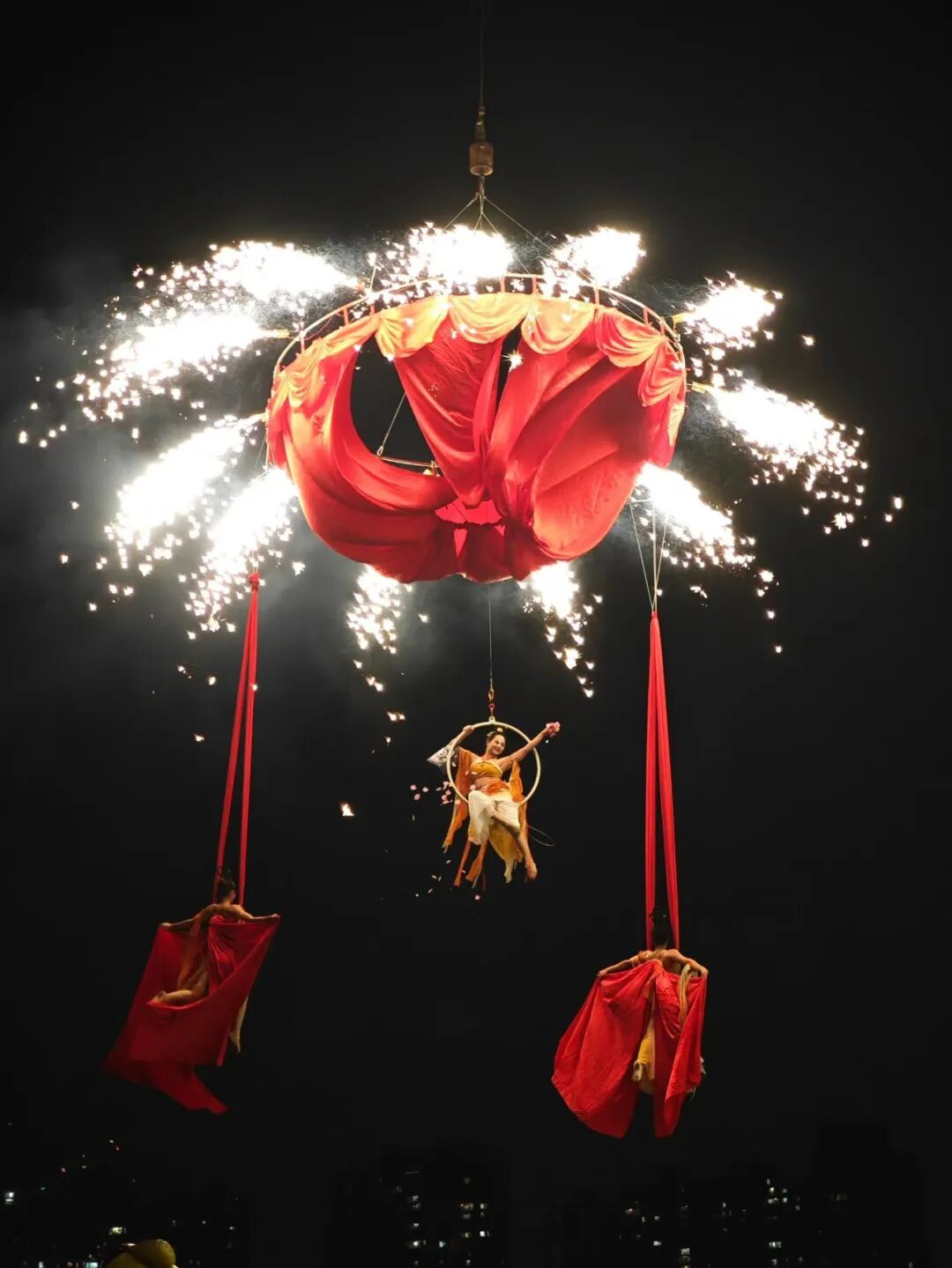 23时整,随着深沉悠远的古乐响起,身着彩衣、披挂璎珞的舞者翩然登场,其姿态灵感源自敦煌莫高窟的飞天壁画。正当观众沉醉于曼妙舞姿时,一簇簇烟花精准地在舞者上方“绽放”。古典艺术和现代科技在此刻完美交融,引来现场阵阵惊叹和掌声。热烈的乐队演出和集体合唱,持续烘托着节日气氛。