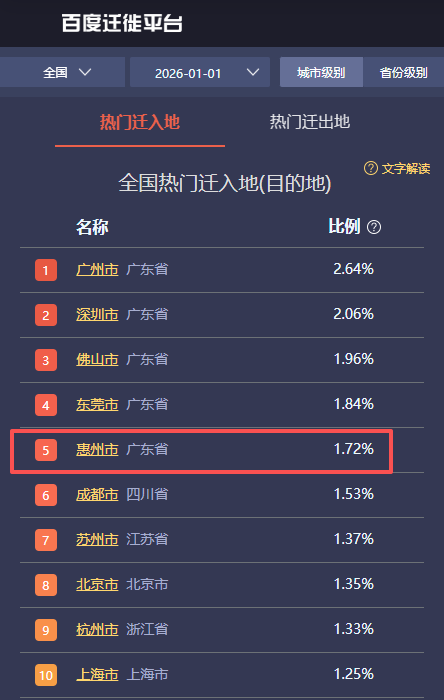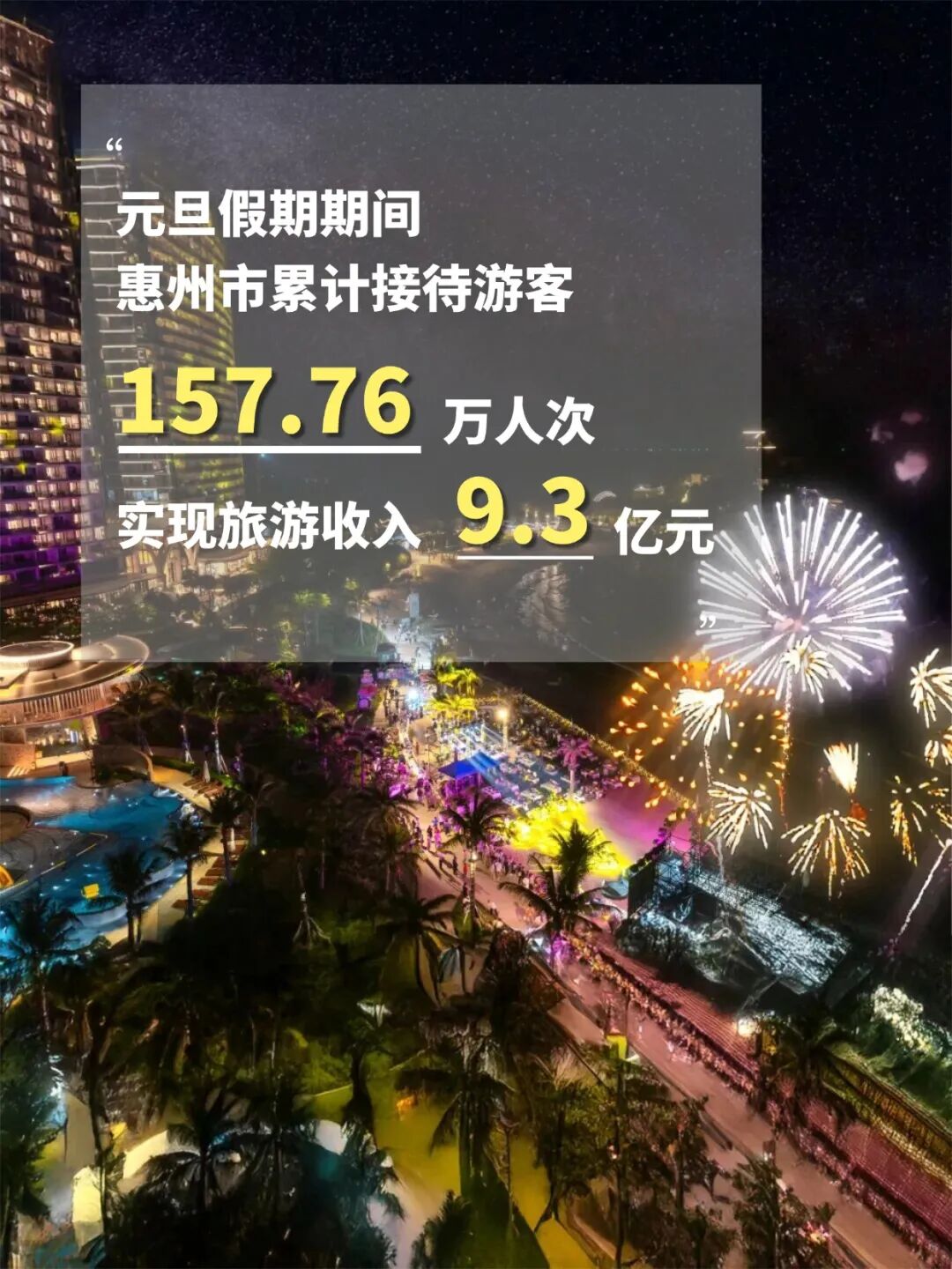 据不完全统计,2026年元旦假期(1月1日至3日),惠州市累计接待游客157.76万人次,实现旅游收入9.3亿元。其中,2026年1月1日,百度迁徙平台显示惠州位列全国热门迁入地(目的地)第5位,1月1日当天接待游客超80万人次,同比增长66.7%,过夜游客同比增长106%,火爆的人气成了惠州文旅魅力的最好证明。