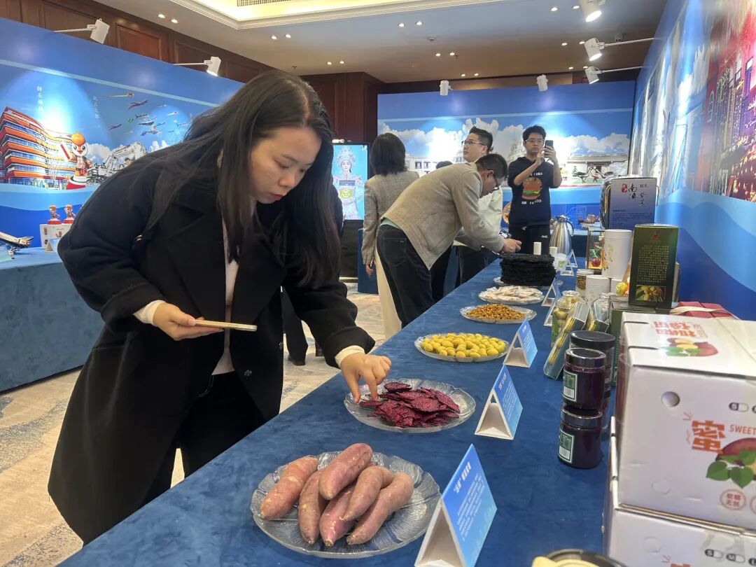 在此次汕头专场活动实物展示部分,濠江区携东湖菊花茶、红心火龙果、榴莲蜜薯等特色农产品组团亮相,参会人员纷纷驻足品尝、交口称赞。