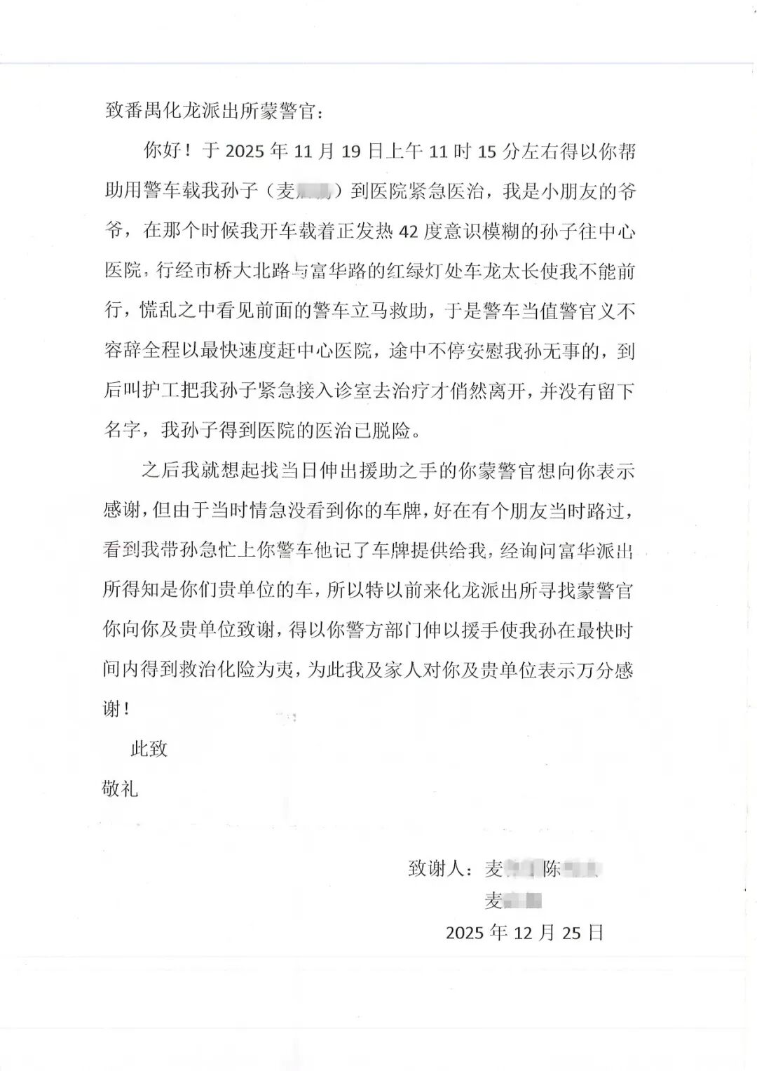 “蒙警官,太感谢您了!是您为我的孙子抢回了最宝贵的抢救时间!”2025年12月25日,市民麦先生携家人专程来到广州市公安局番禺分局化龙派出所,将一面鲜红的锦旗与一封情真意切的感谢信送到民警蒙警官手中,字里行间满含对人民警察危急时刻挺身而出的无尽感激。