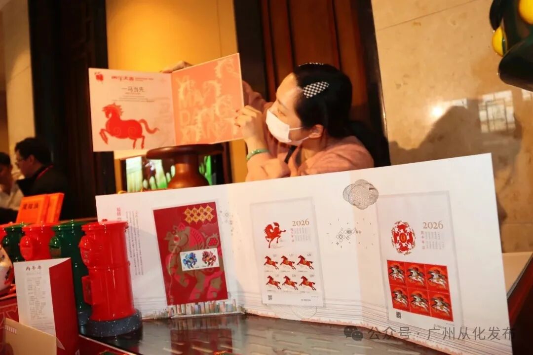 活动现场还设置了“马跃新程・方寸传情2026丙午马年邮票特展”“天马贺穗・邮绘羊城2026年第十二届生肖邮票设计大赛优秀作品展”及特色文创体验区,集中展示中国邮政、港澳邮政及世界各国发行的“马”主题邮票,让市民在沉浸式体验中感受传统文化魅力。