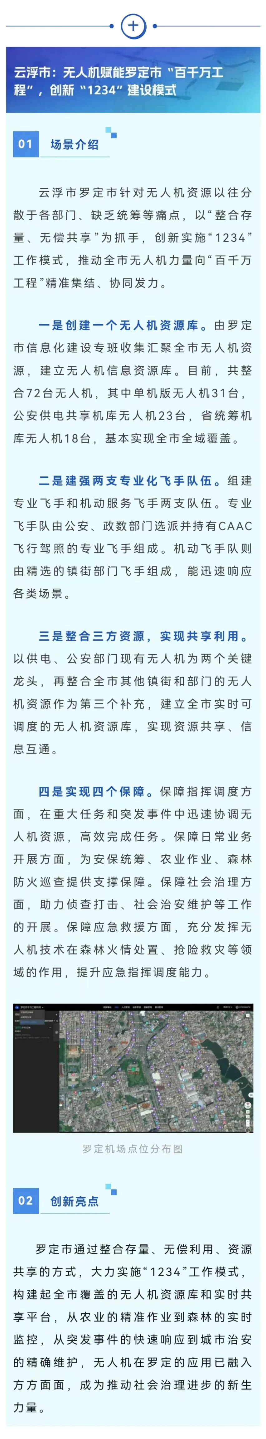 近期,广东聚焦无人机技术与人工智能的深度融合,有效挖掘数据要素价值,赋能政府治理效能提升,发布100个政务领域无人机创新应用场景。这些场景覆盖“百千万工程”指挥调度、城市管理与巡查、环境监测与治理、应急救援与处置、自然资源监管、基础设施巡检、公共卫生与疫情防控、底座赋能与数据共享等8大领域,全方位展现“N”类应用的实践成效。其中,《云浮市:无人机赋能罗定市“百千万工程”,创新“1234”建设模式》入选。