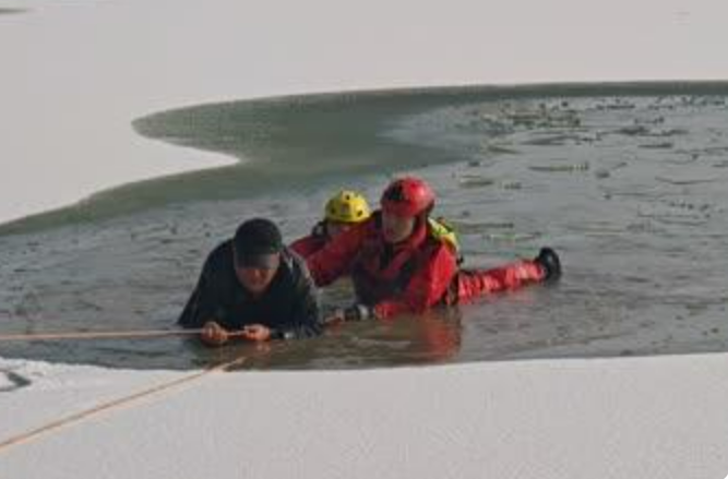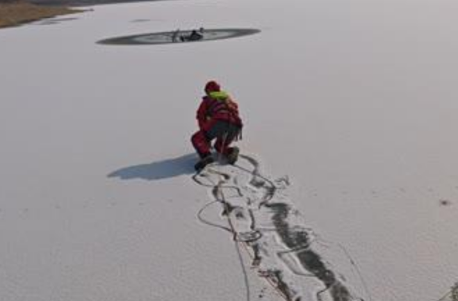 消防员一边高声安抚,一边快速研判环境,确定采用“绳索锚固、匍匐接近、拖曳救援”的方案。三名救援人员穿戴好干式救生服,将安全绳系于腰间,另一端由岸上队员控制,随即以低姿匍匐方式,手脚并用向老人缓慢靠近。每一步移动都格外谨慎,防止冰面因集中受力再次破裂。