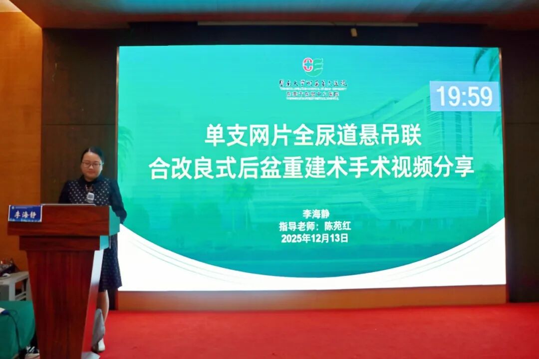 暨南大学附属第六医院(东莞市东部中心医院)妇科主任医师陈苑红重点介绍了“单支网片全尿道悬吊联合后盆生物力学重建术 ”的临床体会,展示了该技术在治疗盆底器官脱垂合并压力性尿失禁的优势与操作要点,体现了名医工作室在技术创新与临床转化方面的引领作用。