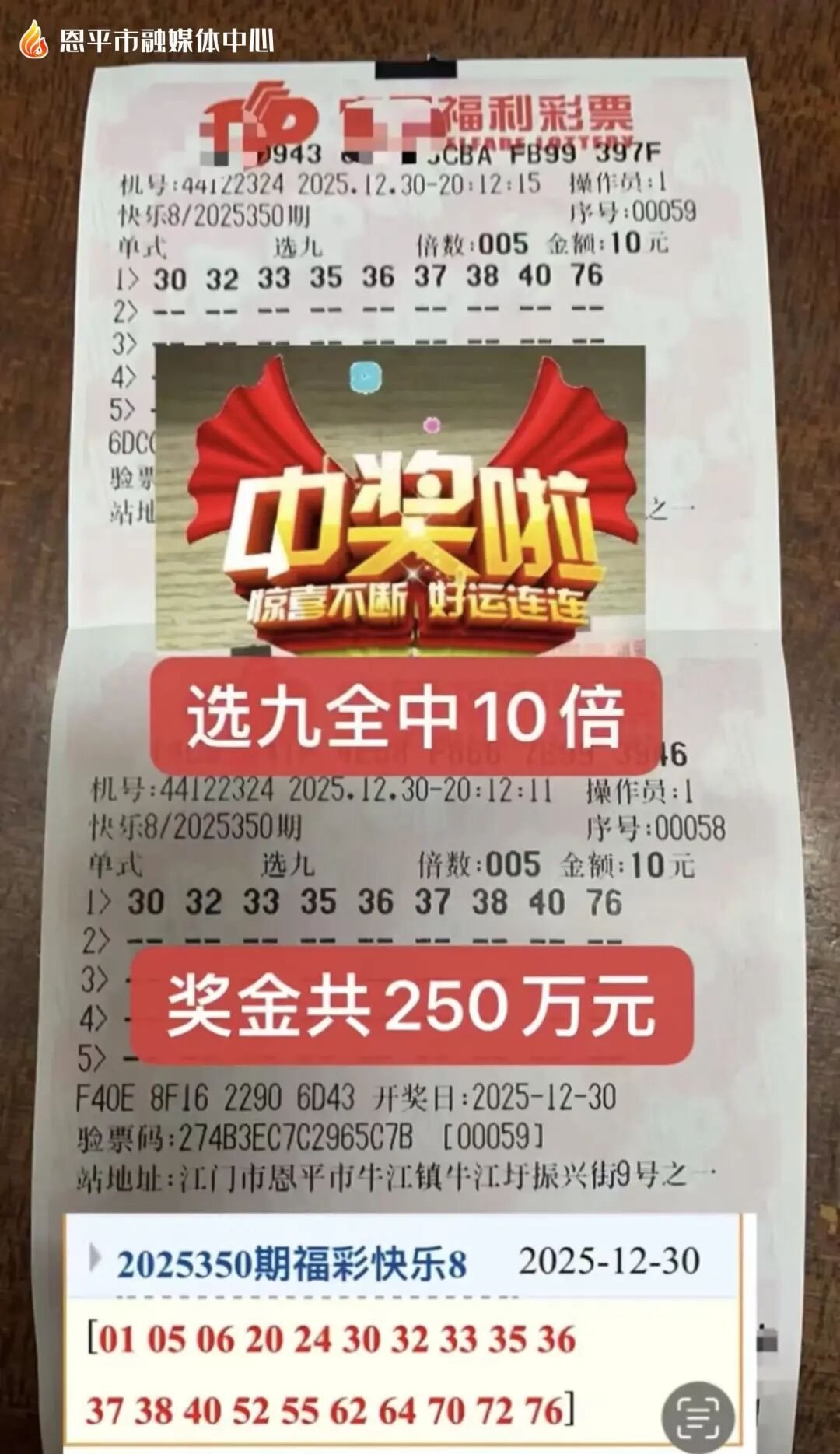 恩平有人中了250万元!