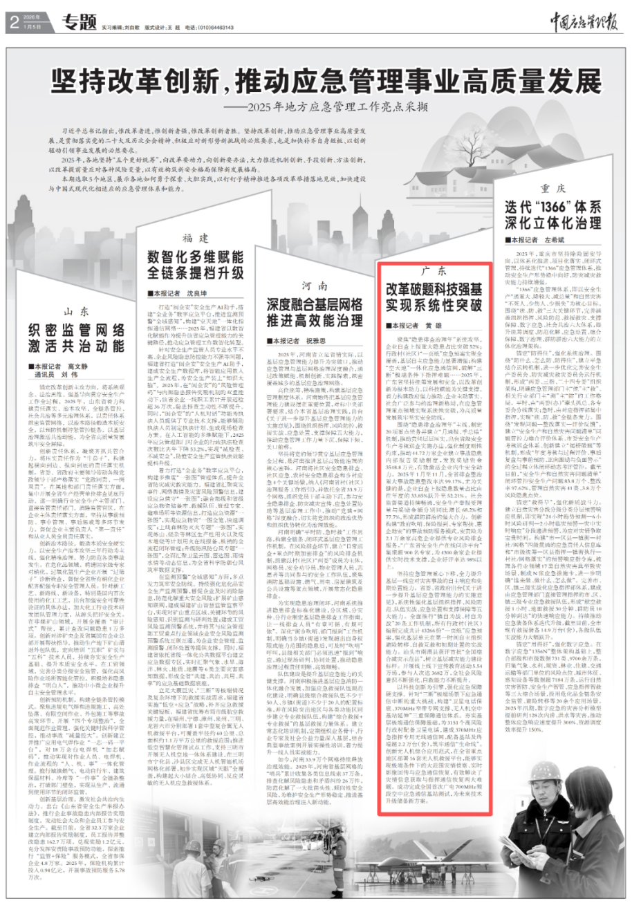 1月5日,《中国应急管理报》第2307期刊发题为《坚持改革创新,推动应急管理事业高质量发展——2025年地方应急管理工作亮点采撷》的文章,其中《改革破题科技强基 实现系统性突破》专题报道了广东通过压实隐患排查治理责任、实现行政村(社区)“一页纸”应急预案全覆盖、构建“空天地”一体化应急通信网络等系列举措,在提升企业内生安全动力、强化基层自主应急能力、破解“三断”极端条件下指挥难题等应急管理重点领域实现系统性突破。