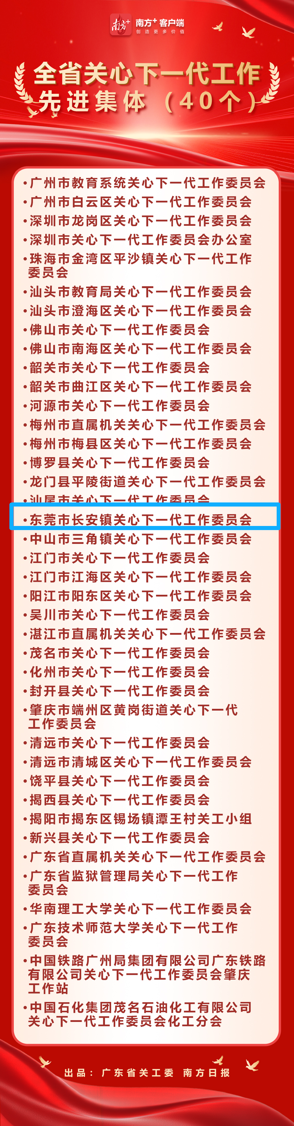 近日,纪念广东省关工委成立25周年暨全省关心下一代工作表彰会议召开,会上表彰40个“全省关心下一代工作先进集体”、80名“全省关心下一代工作先进个人”。其中,东莞市长安镇关心下一代工作委员会荣获“全省关心下一代工作先进集体”称号,成为本次表彰会中全市唯一一个获此称号的镇街关工委。