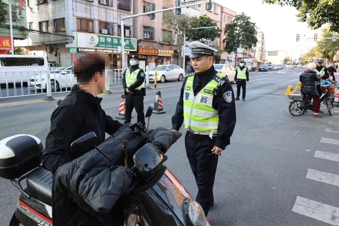 在位于辖区东风路一带,笔者看到,石碣公安交管、派出所、巡警大队等多警种联合在重点路口设点开展整治行动,有部分不按规定车道行驶、不佩戴安全头盔、故意遮挡号牌的电动自行车驾驶人被执勤警员当场拦下,依法接受相应处罚。