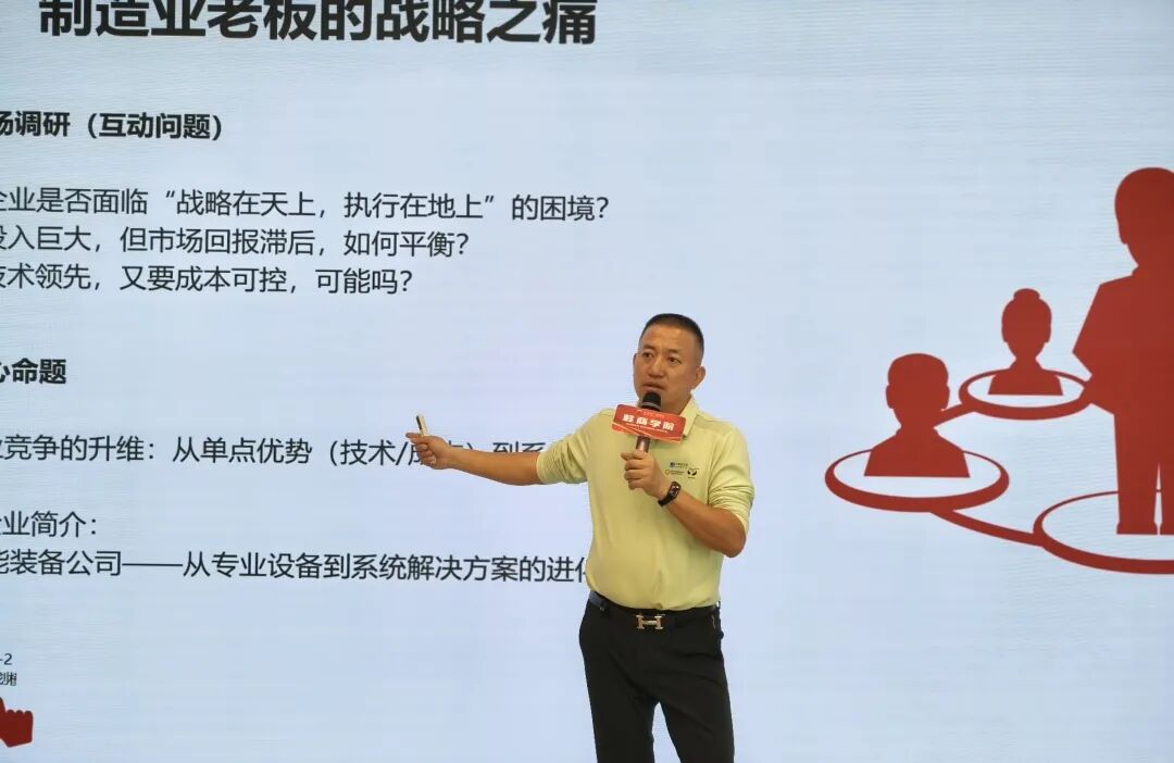 随后,李院长直击制造业老板的“战略之痛”。 他从“战略在天上,执行在地上”的普遍困境切入,通过现场调研互动,引出本次分享的核心命题:制造业的竞争已从单一的技术或成本优势,升维至构建系统优势的立体战。他以一家智能装备公司的进化之路为案例,生动诠释了这一转型过程。