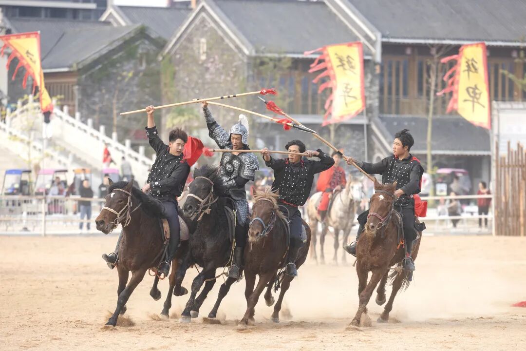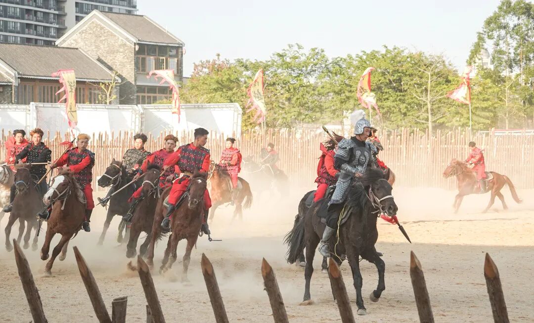 大型马战《岭南长风》重现赵佗开疆拓土的壮阔史诗,策马奔腾、空中翻转的惊险动作,搭配马蹄声与呐喊声,堪称一场视觉盛宴。