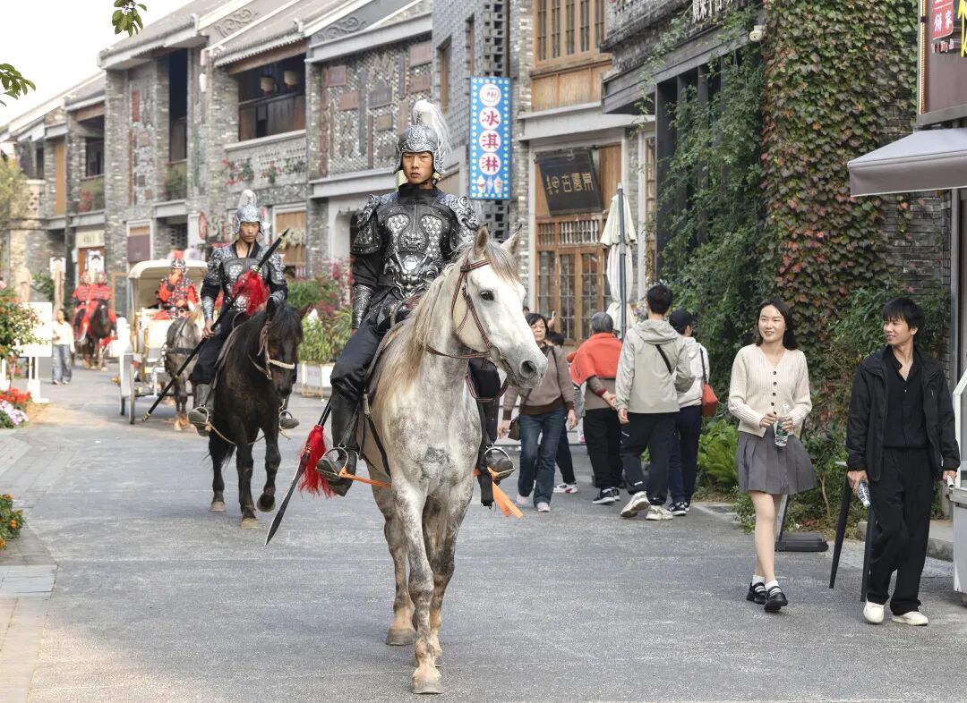 魔术表演在盛艺阁带来奇幻惊喜,武大郎巡街、马队巡街穿梭在岭南风情小镇,热闹非凡。