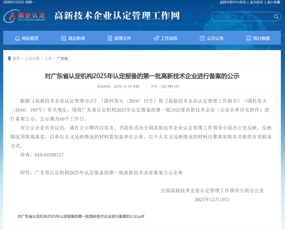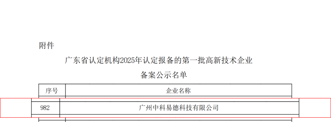 近日,全国高新技术企业认定管理工作领导小组办公室正式发布《对广东省认定机构2025年认定报备的第一批高新技术企业备案公示》,广州软件应用技术研究院(简称:广州软件院)孵化企业广州中科易德科技有限公司(简称:中科易德)顺利通过高新技术企业复评。