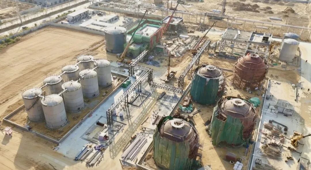 项目建设现场塔吊高耸、车辆穿梭、机械轰鸣,施工团队分区作业,稳步推进储罐区基础加固、构件焊接等关键工序,建材转运、设备调试等环节衔接紧密。主体综合楼内部砌筑、外部装饰及周边管网铺设正有序开展。