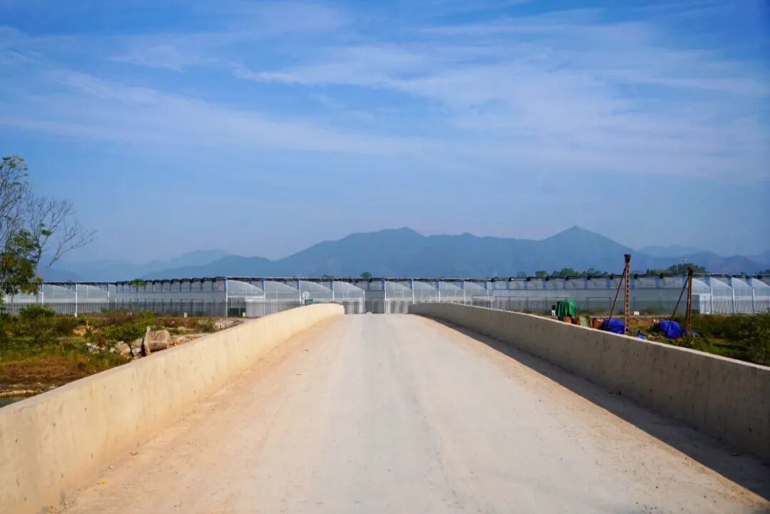 桥一侧是崭新的双向柏油路和连片蔬菜基地,