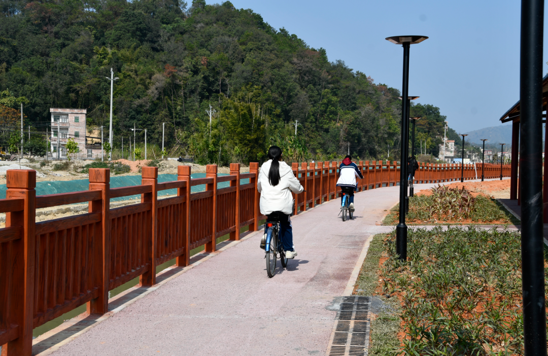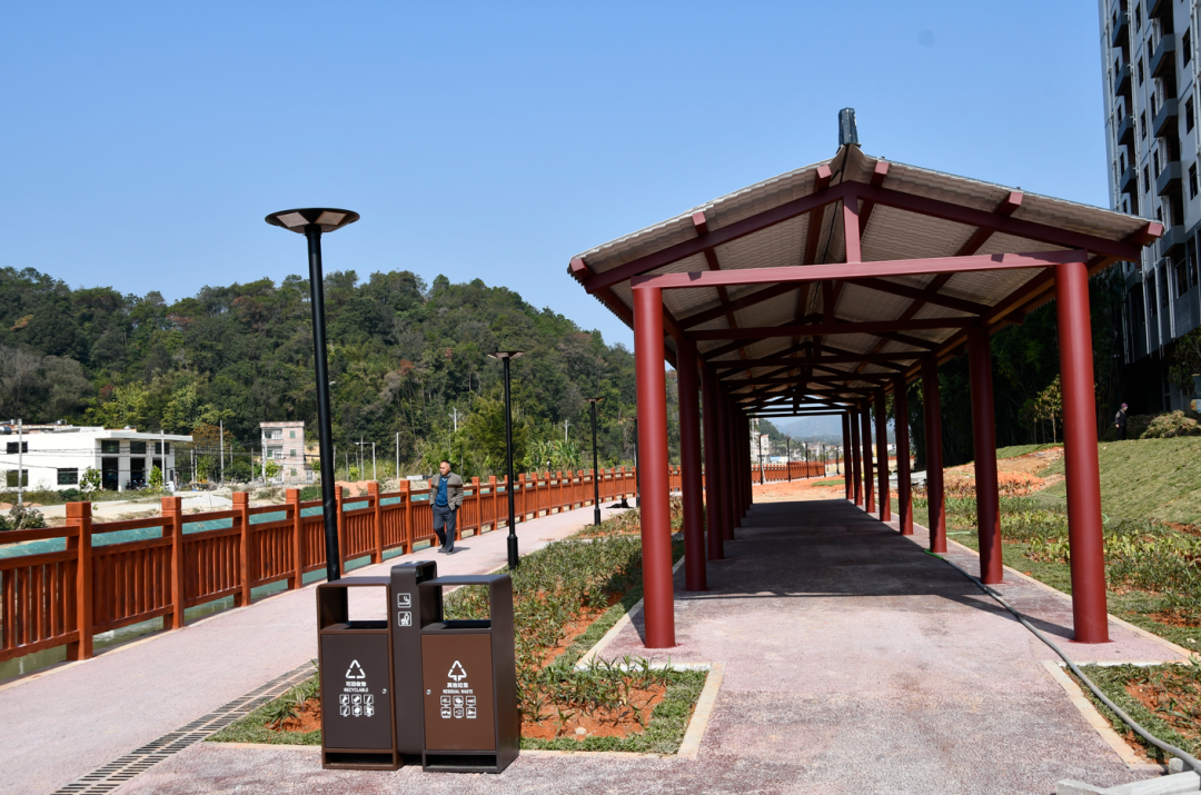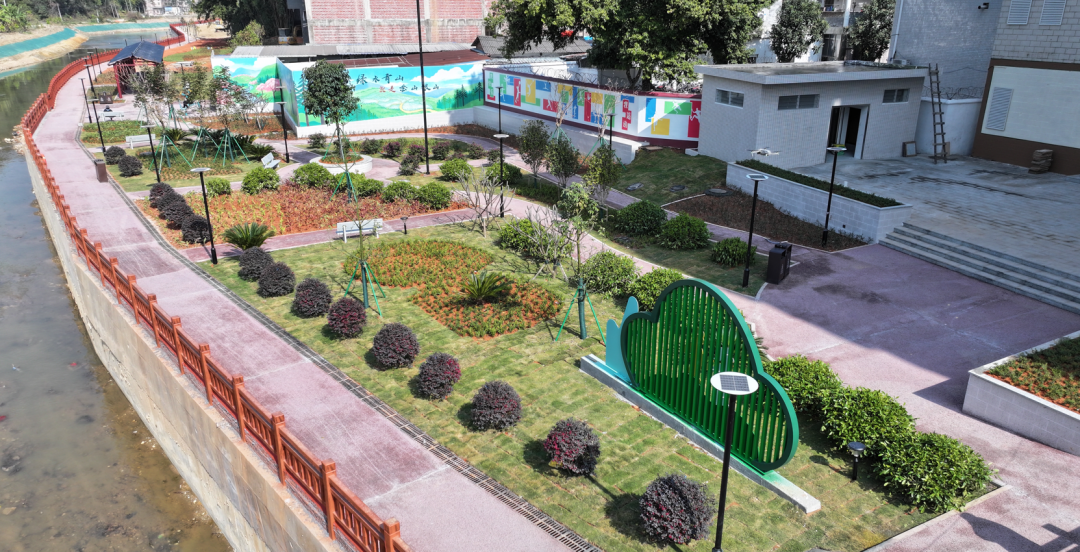 2025年,诗洞镇以绿美生态小公园为起点,至美丽入口通道为终点,同步打造长度约1公里、宽度2米的美丽河道碧道。沿线配套标识标牌、垃圾箱、绿化树、特色路灯等设施,不仅让圩镇人居环境颜值再升级,更串联起圩镇客厅、绿美公园等核心节点,成为村民散步休闲、跑步锻炼的新晋“打卡地”。