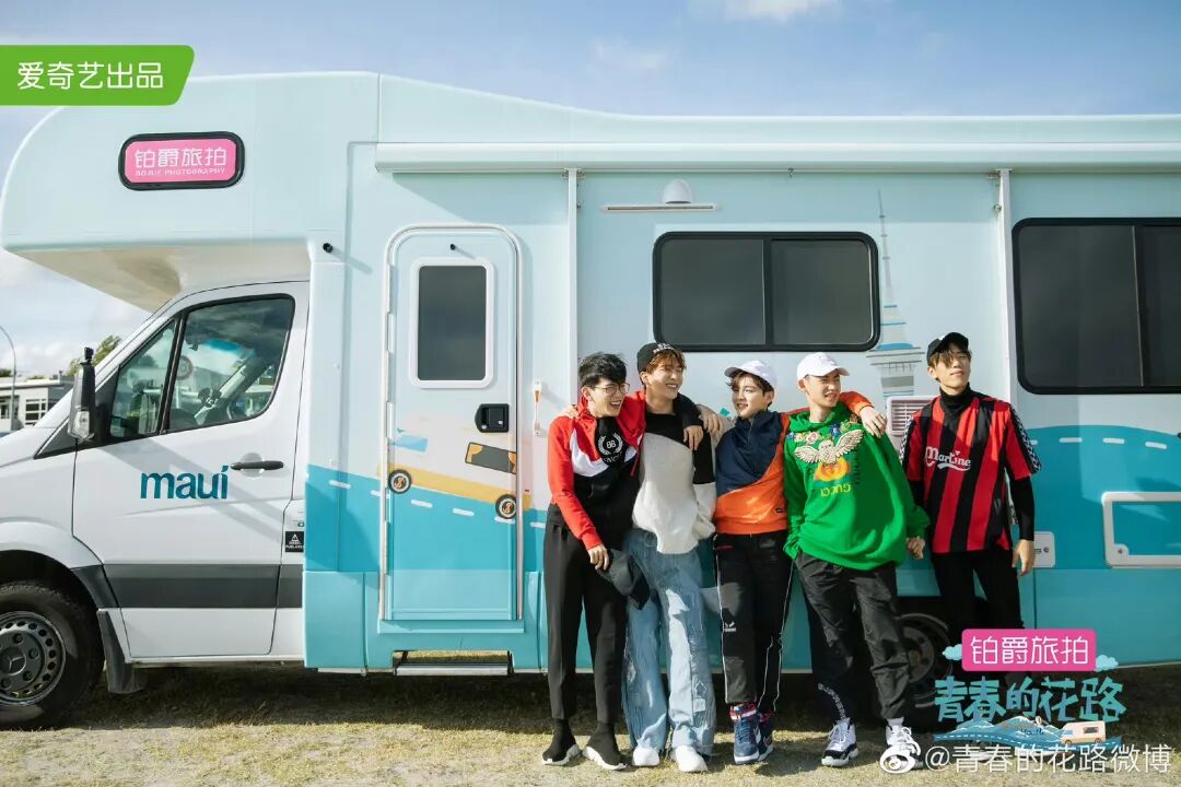《青春的花路》嘉宾与房车合影(图片源自青春的花路微博)