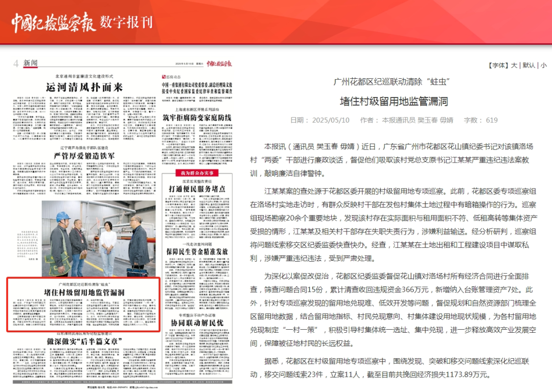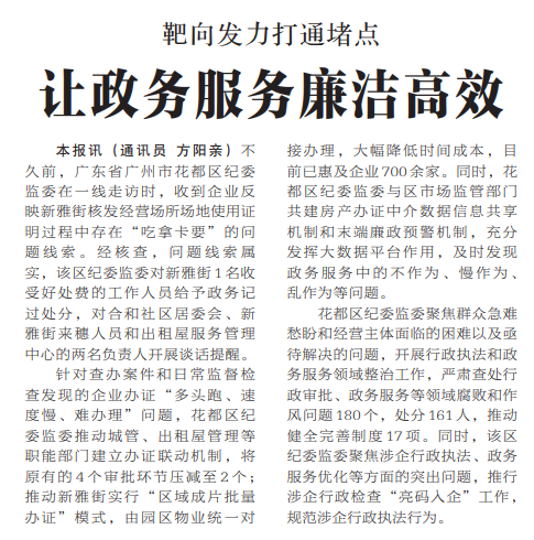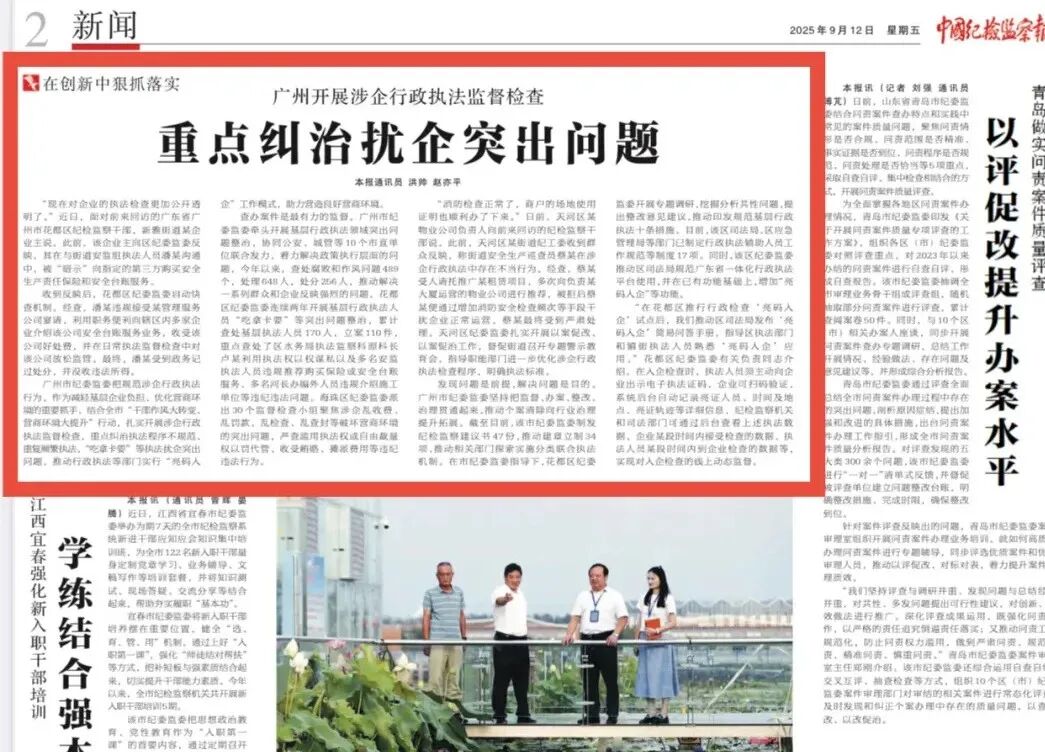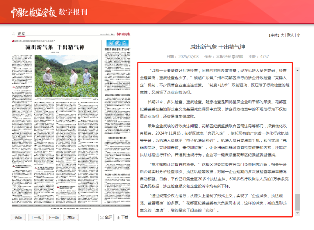 ▲2025年7月8日,《中国纪检监察报》4版“观察”栏目刊登花都区纪委监委推动行政执法等部门实行“亮码入企”为基层减负的有关工作内容。