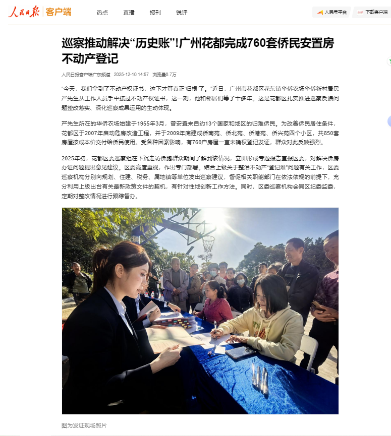 2025年,花都区委巡察机构始终践行以人民为中心的发展思想,紧盯群众急难愁盼问题,聚焦居民住房、基础设施、环境治理等民生领域,通过实地走访、召开座谈等方式,推动被巡党组织解决民生实事57件,惠及群众数万人。