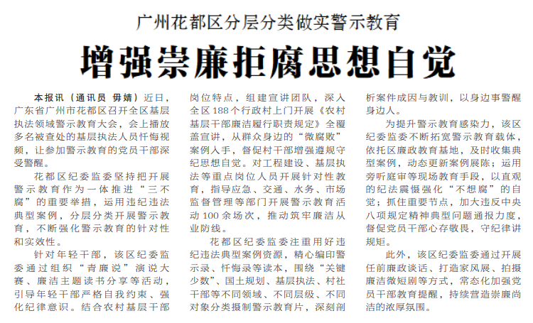 2025年,花都区纪委监委坚持把开展警示教育作为一体推进“三不腐”的重要举措,运用违纪违法典型案例,分层分类开展警示教育,不断强化警示教育的针对性和实效性。结合农村基层干部岗位特点,组建宣讲团队,深入全区188个行政村上门开展《农村基层干部廉洁履行职责规定》全覆盖宣讲;注重用好违纪违法典型案例资源,围绕“关键少数”基层执法、村社干部等摄制警示教育片;召开全区基层执法领域警示教育大会,推动筑牢廉洁从业防线等。