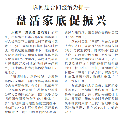2025年,花都区纪委监委以农村集体“三资”问题合同整改为切入口,开展清产核资和“回头看”行动,全面整治农村集体“三资”问题合同,通过“室组地”协作联动,起底各类问题线索,深入查处侵占集体土地、挪用侵占集体资金以及合同监管失职等农村集体“三资”管理中的违纪违法问题,共立案109件,处分90人。