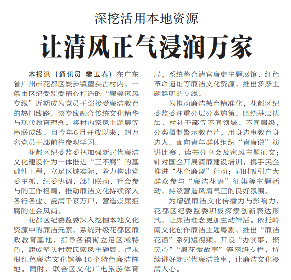 2025年,花都区纪委监委把加强新时代廉洁文化建设作为一体推进“三不腐”的基础性工程,立足区域实际,系统开展“廉美花都”全域廉洁文化品牌创建,通过实施“阵地筑廉、线路绘廉、单元创廉、活动倡廉、文化养廉”五大行动,推动廉洁文化持续深入各行各业、浸润千家万户。多项工作成效被新华社、央视频、《中国纪检监察报》等中央媒体宣传报道。