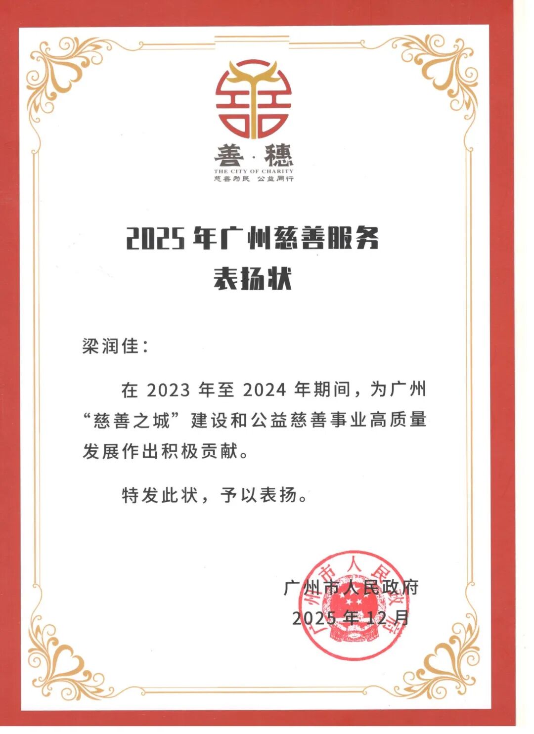 近日,黄广教育集团收到广州市人民政府颁发的表扬状,对梁润佳董事长为广州“慈善之城”建设和公益慈善事业高质量发展所作出的积极贡献予以表扬。