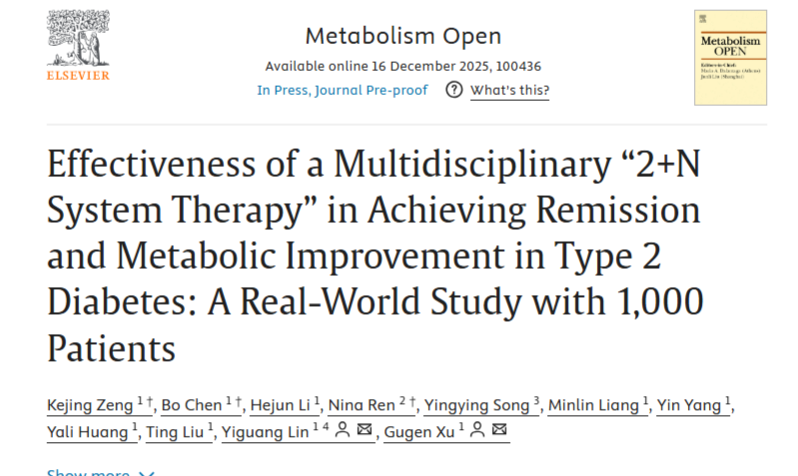 论文题为《Effectiveness of a Multidisciplinary ‘2+N System Therapy’ in Achieving Remission and Metabolic Improvement in Type 2 Diabetes: A Retrospective Real‐World Study》(《多学科“2+N系统疗法”在2型糖尿病缓解及代谢改善中的疗效:一项回顾性真实世界研究》)。这标志着我院在糖尿病综合管理领域的创新理念与实践,获得了国际同行的进一步关注与学术认可,为医院临床科研高质量发展再添标志性成果。