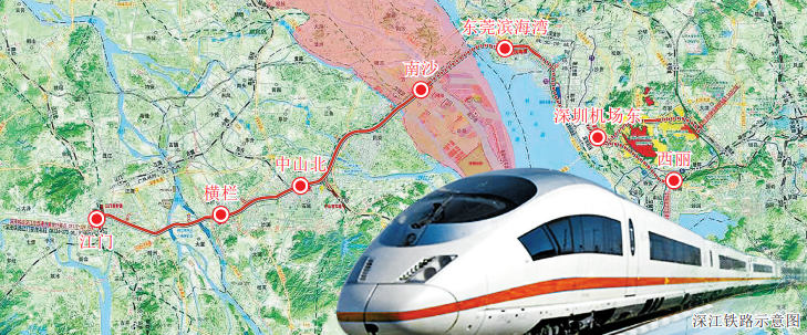深江铁路线路跨越珠江口,串联深圳、东莞、广州、中山和江门5座大湾区城市,是全国“八纵八横”高铁主通道沿海通道的重要组成部分,也是珠三角地区主要跨江城际通道。