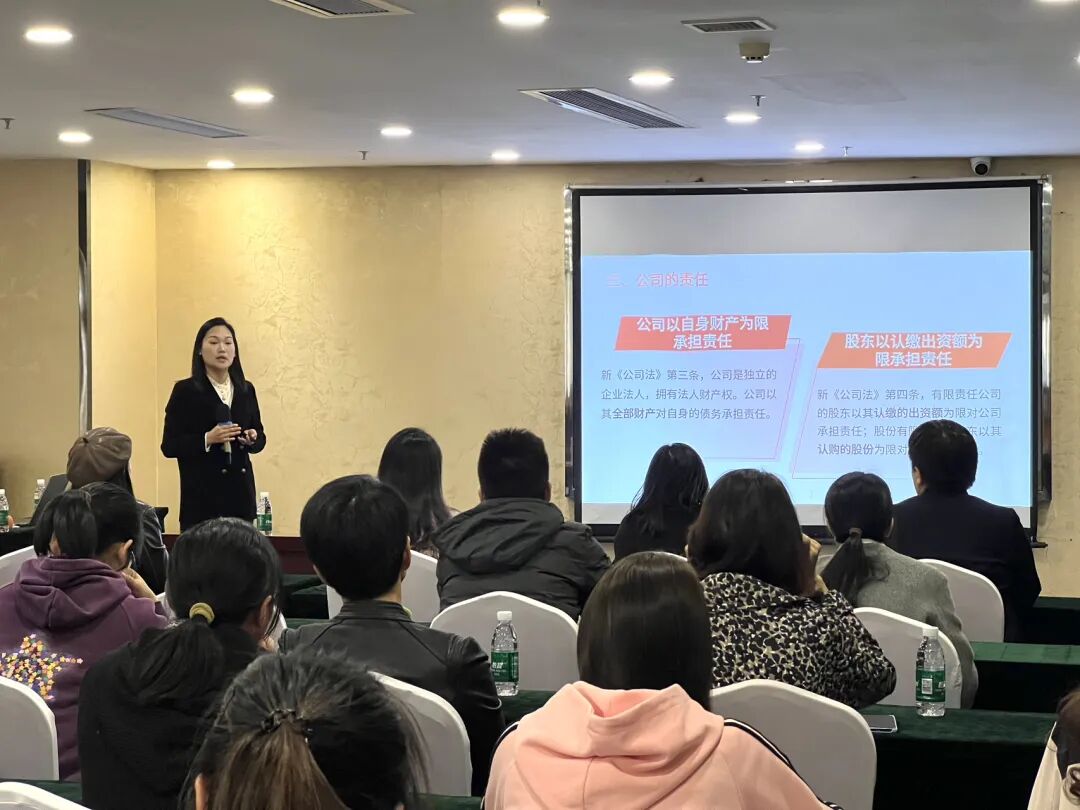 宣讲会特别针对民法典和公司法中关于个体工商户和有限责任公司常出现的法律风险,包括责任承担的方式、未实缴注册资本、抽逃出资、减资流程、转让股权逃废债等实务热点进行了深入解析。