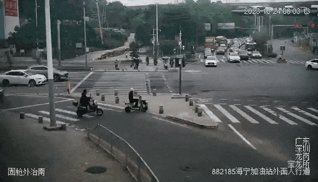 2023年10月24日,一名电动车驾驶人未佩戴头盔,闯红灯与小车发生碰撞。事故瞬间,电动车驾驶人头部重重撞向小汽车前玻璃窗,而其悬挂于车头位置的头盔遭受撞击后被甩到路边。事故造成电动车驾驶人受重伤。