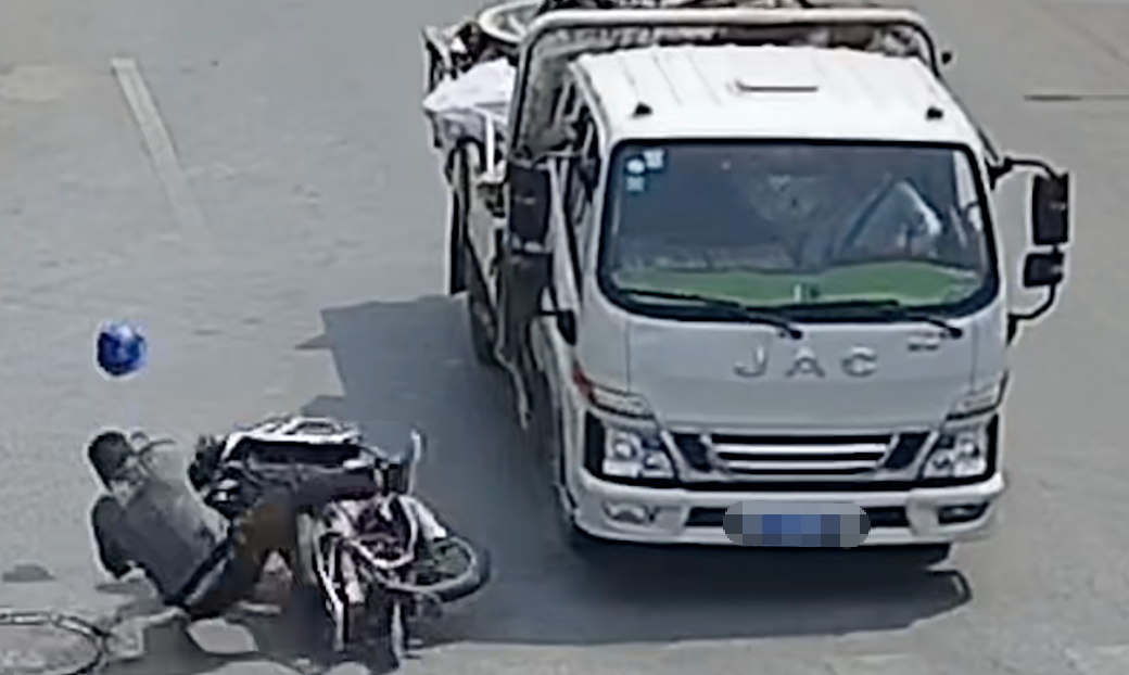 某路口发生一起电动自行车与货车碰撞的事故。碰撞发生后,电动自行车驾驶人罗某摔倒在地,并被卷入车底,头部被货车右轮两次碾压。万幸的是,罗某当时正确佩戴了安全头盔,有效保护了头部,因此头部无伤,无生命危险。