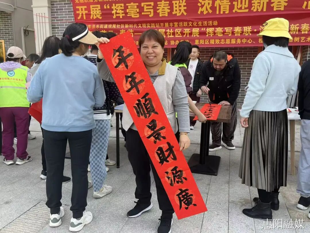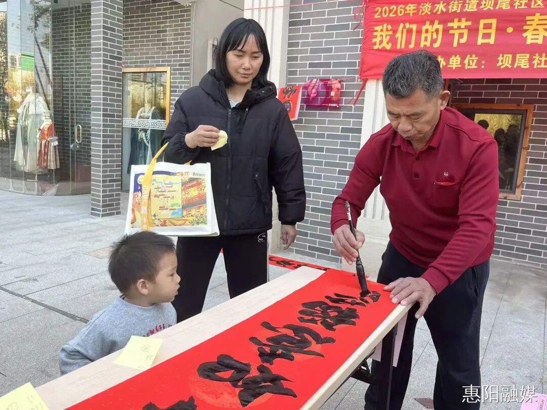 1月15日上午,坝尾社区淡水墟圆球小广场洋溢着喜庆祥和的氛围。坝尾社区党委联合淡水街道社工站、惠阳区精致志愿服务中心,共同举办“挥毫写春联·浓情迎新春”主题活动。