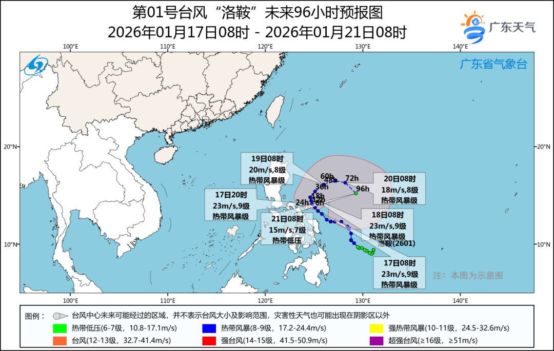 17日08时,今年的第1号台风“洛鞍”(热带风暴级)中心位于菲律宾马尼拉东偏南方向约495公里的洋面上,也就是北纬13.4度、东经125.4度,中心附近最大风力9级(23米/秒),中心最低气压为990百帕。