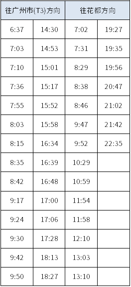 城际列车:T2交通中心进站,6分钟直达白云机场东站(T3),票价5元,全天平均约17分钟一班。出站后步行3分钟即达出发大厅。
