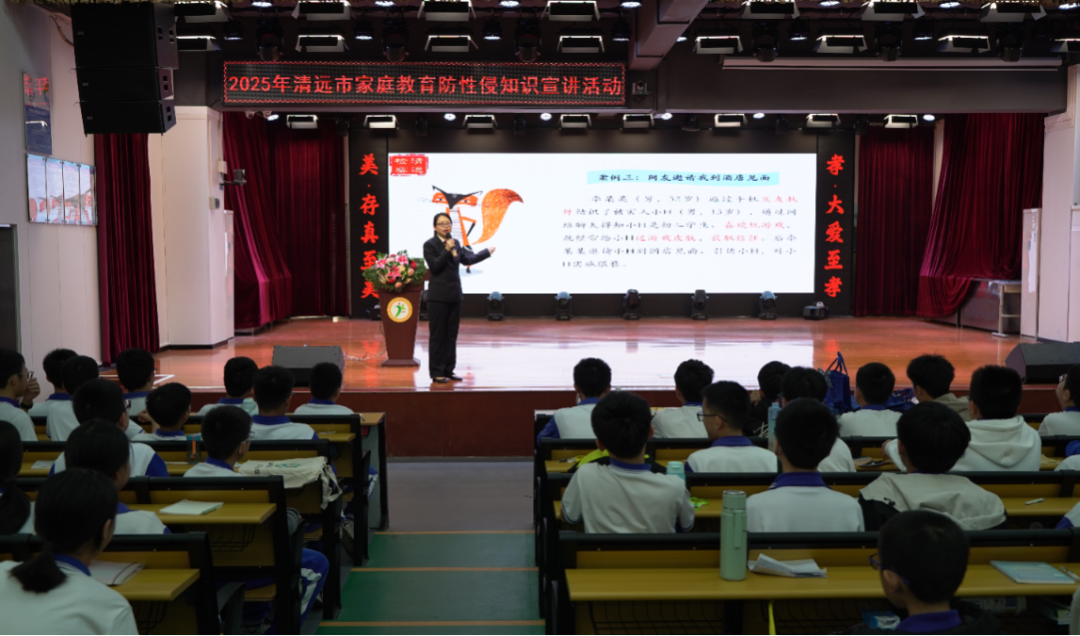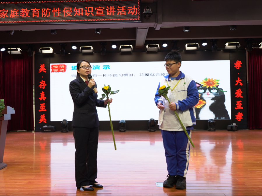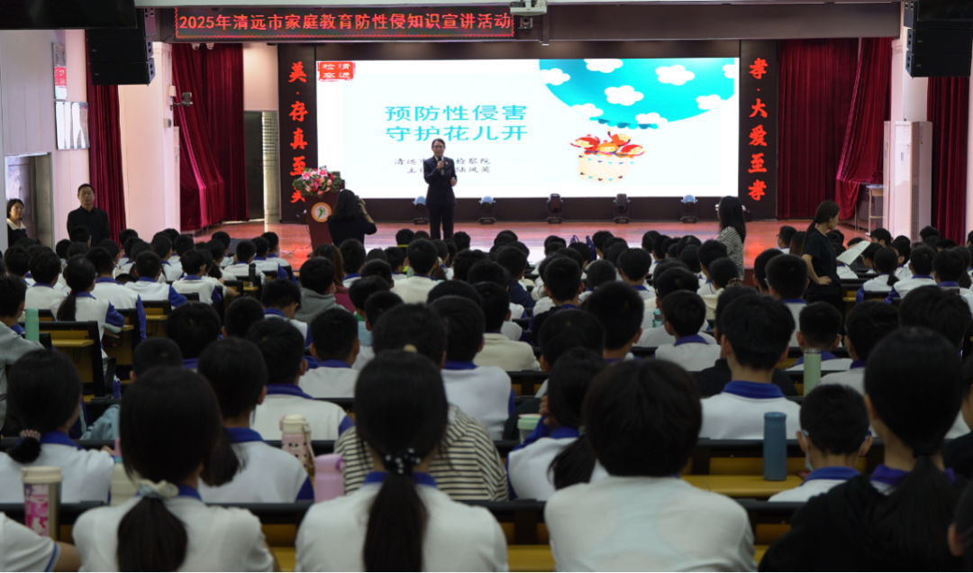 为切实筑牢未成年人安全防护网,增强青少年自我保护意识和法治观念,日前,清远市人民检察院第二检察部干警走进新北江实验学校,为该校初中生带来了一场主题为“预防性侵害 守护花儿开”的专项宣讲活动。活动以互动式、沉浸式的教学方式,让学生们在轻松氛围中学习防性侵知识,现场反响热烈,取得了良好的宣传教育成效。