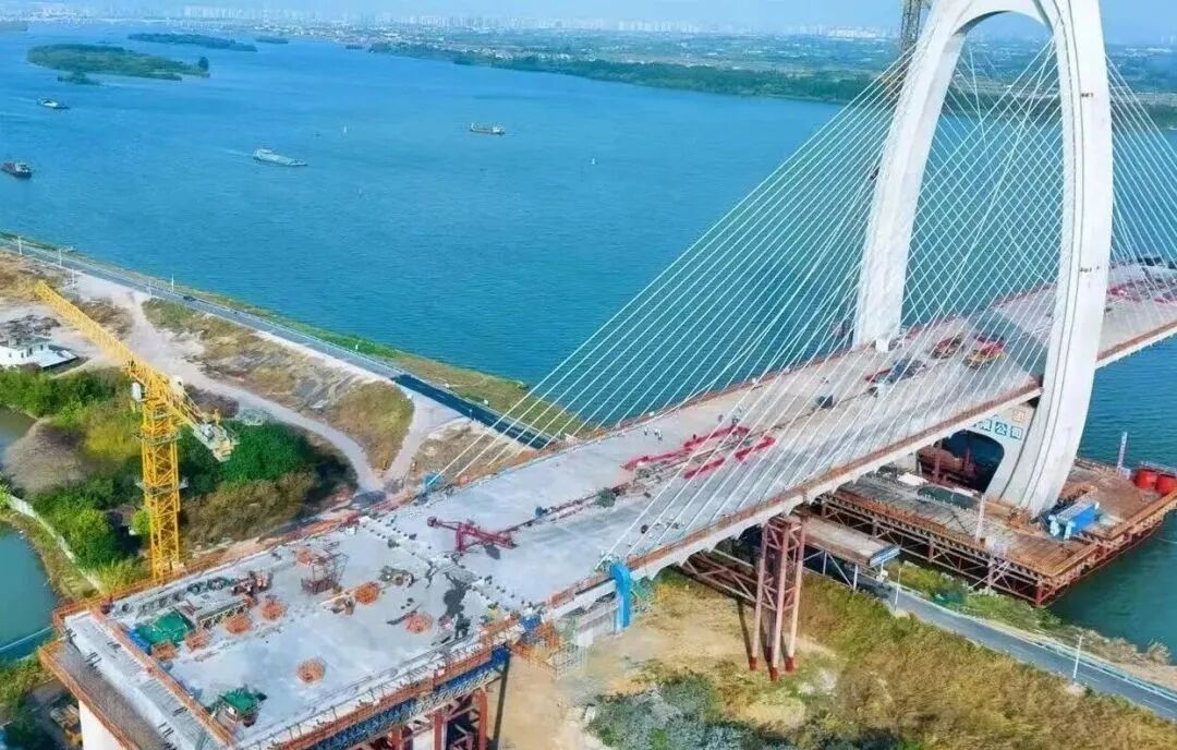北江特大桥是项目关键控制性工程,主桥全长1440米,是目前国内规模最大的四塔双索面双向预应力混凝土梁斜拉桥,索塔塔身形似“钻石”,塔冠宛若“凤凰尾翼”,造型独特,线形优美流畅。大桥两侧均设有边跨和次边跨,与中跨合计为5个施工段,此次合龙为两侧边跨。
