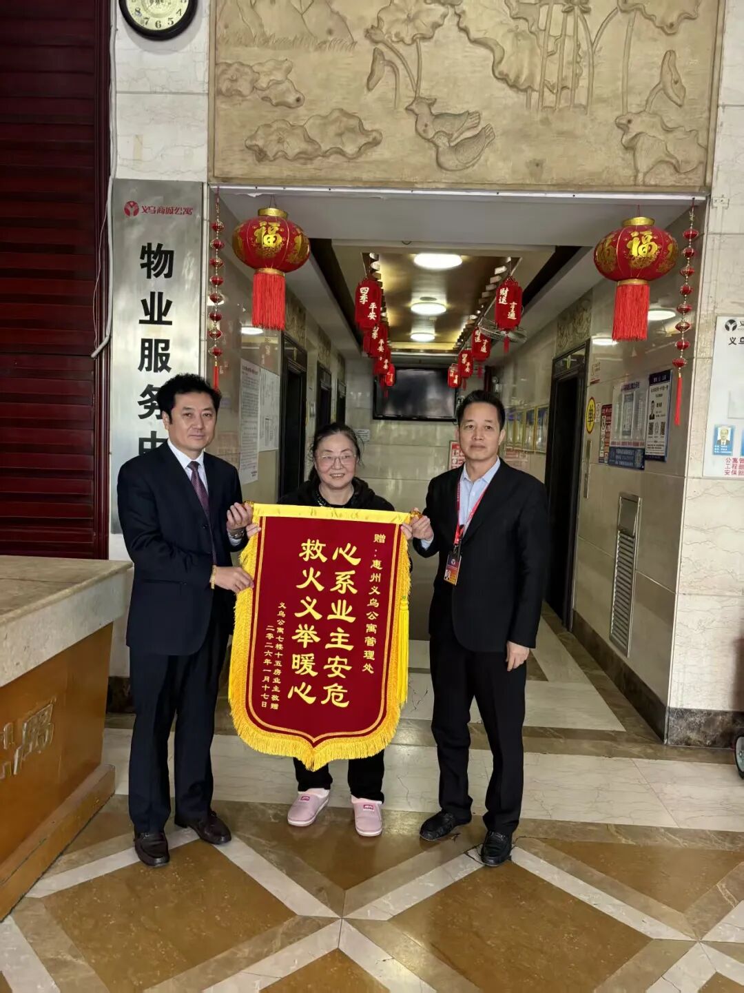 “都还没来得及通知物业,他们就跟天降奇兵似的赶到了!”为表达谢意,117日,业主王姨专程将锦旗送到了物业服务中心,对物业团队的专业素养和英勇担当表示高度赞扬。