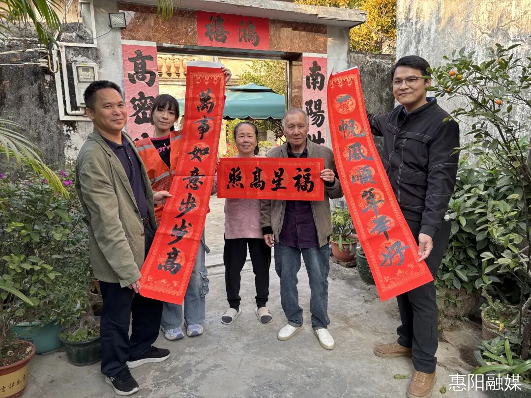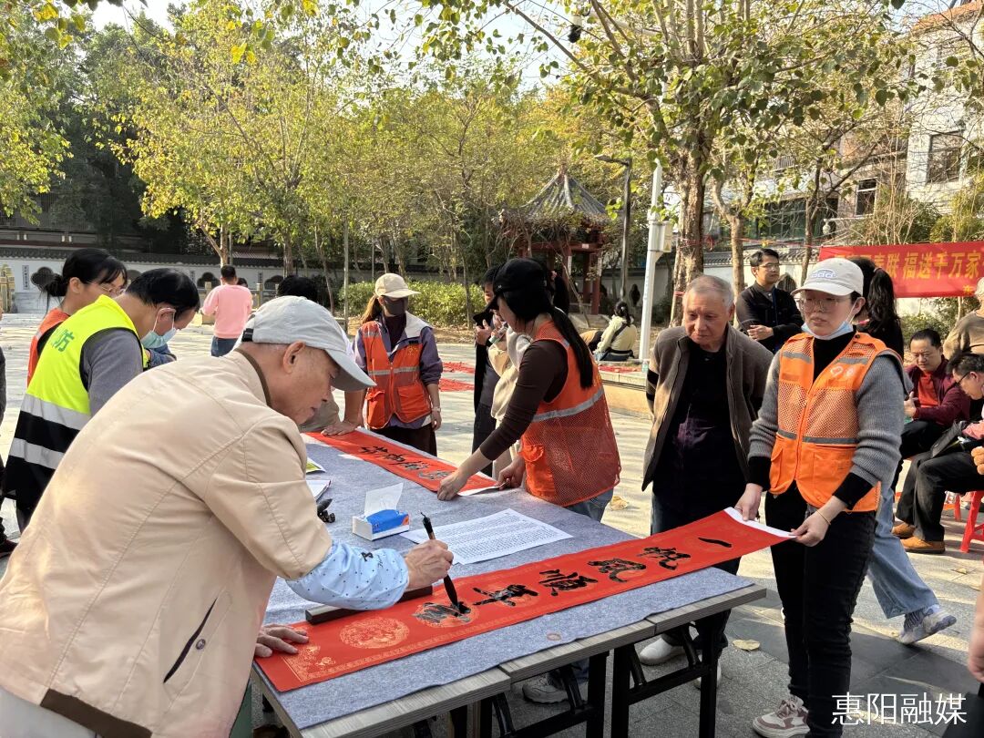 活动现场,惠阳诗社书法家们备受瞩目。他们笔走龙蛇,在案头铺展大红宣纸,写下寓意吉祥的春联和遒劲的“福”字。居民热情高涨,围在书桌旁,有的驻足欣赏、啧啧称赞,有的挑选春联、交流互动,现场热闹喜庆。