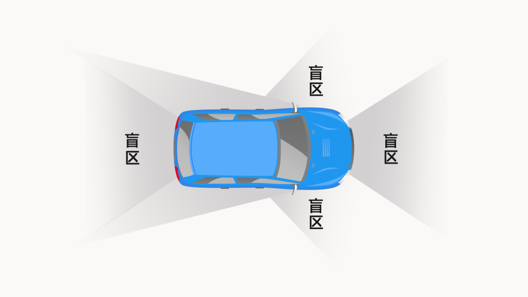 大型车辆由于车身高、前柱宽、后视镜有死角,存在多个视觉盲区。若不仔细观察,这些区域完全看不见!